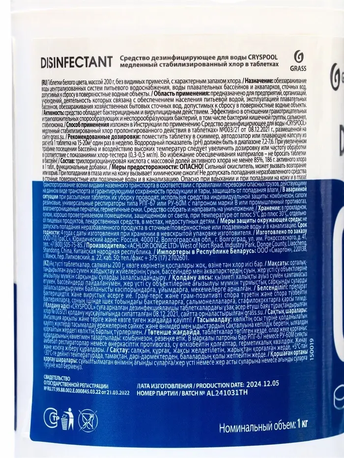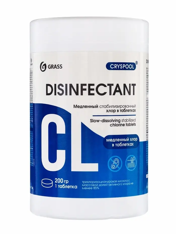 CRYSPOOL — дезинфицирующее средство пролонгированного действия для бассейнов. Медленнорастворимые таблетки на основе стабилизированного хлора обеспечивают равномерную и продолжительную дезинфекцию воды, поддерживая стабильный уровень свободного хлора в течение нескольких дней.