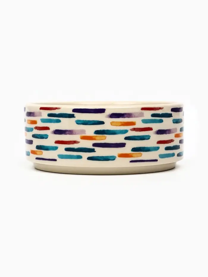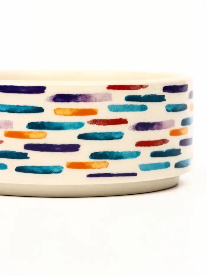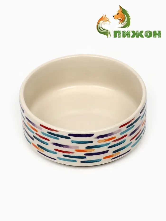 - Современный дизайн: Рисунок «Акриловые полоски» добавляет миске выразительности. Разноцветные вставки на белом фоне создают ощущение динамики и подходят под разные интерьеры.