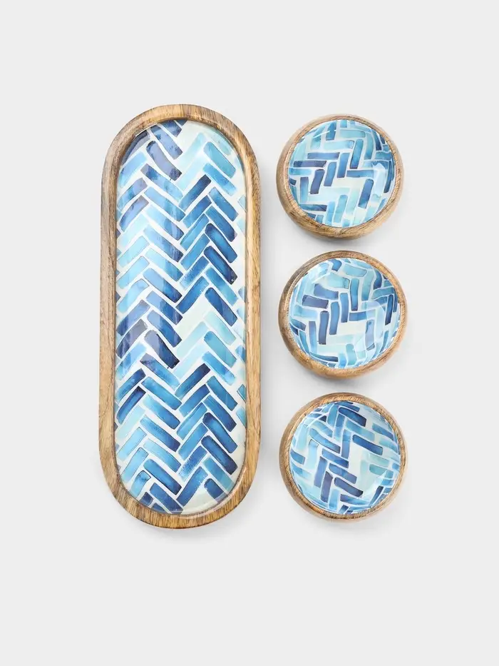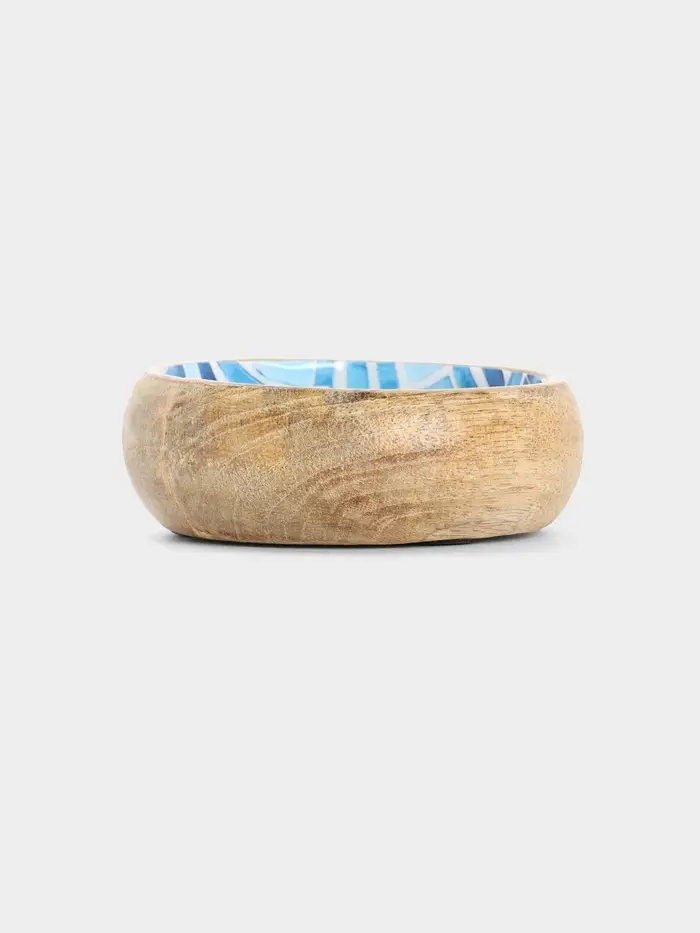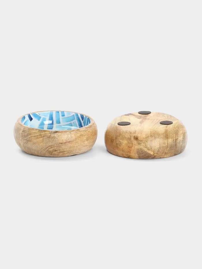 - Уникальный дизайн ручной работы: Гладкая поверхность дерева манго украшена геометрическим узором в технике мозаики. Сочетание глубокого синего и натурального бежевого создает современный и сбалансированный акцент. Такой набор розеток становится изюминкой сервировки.