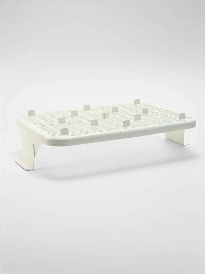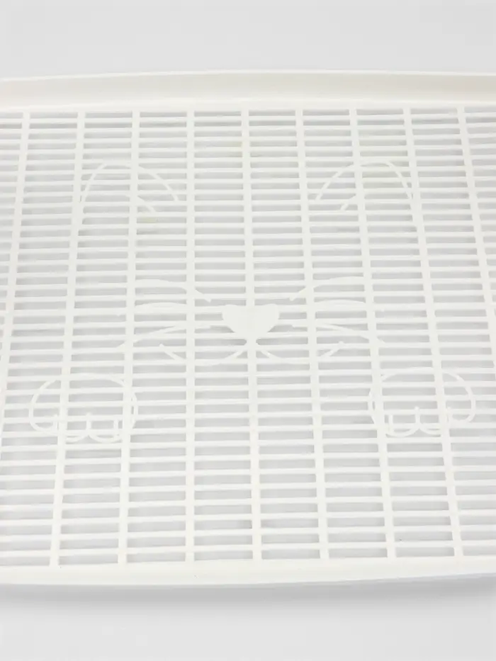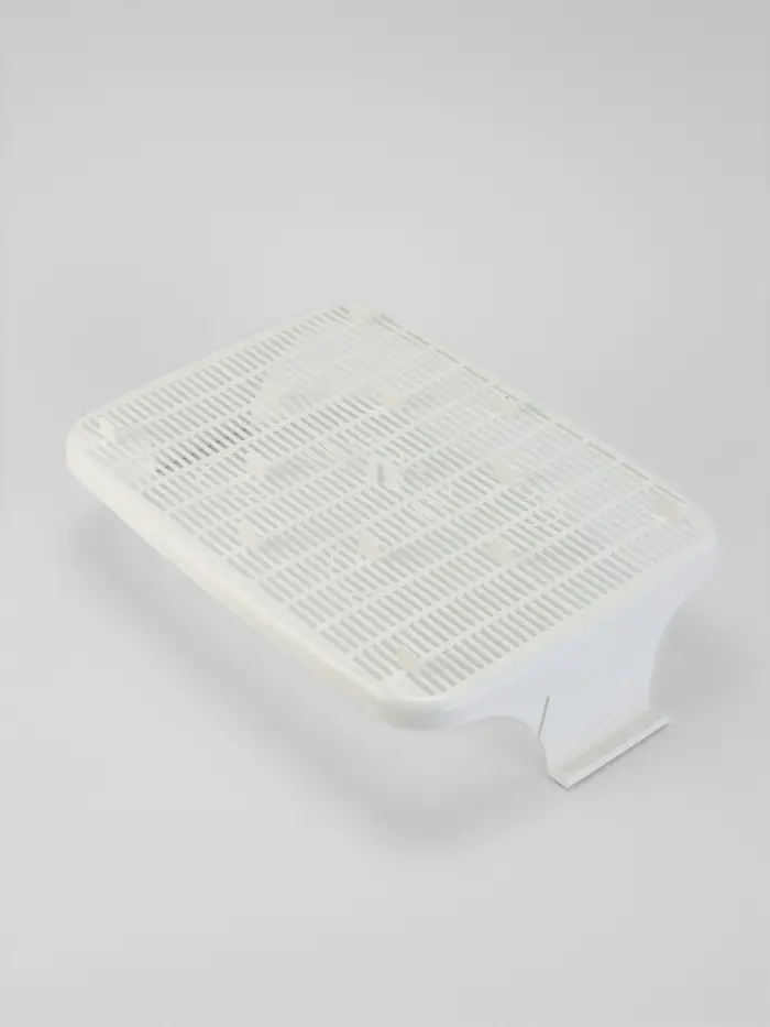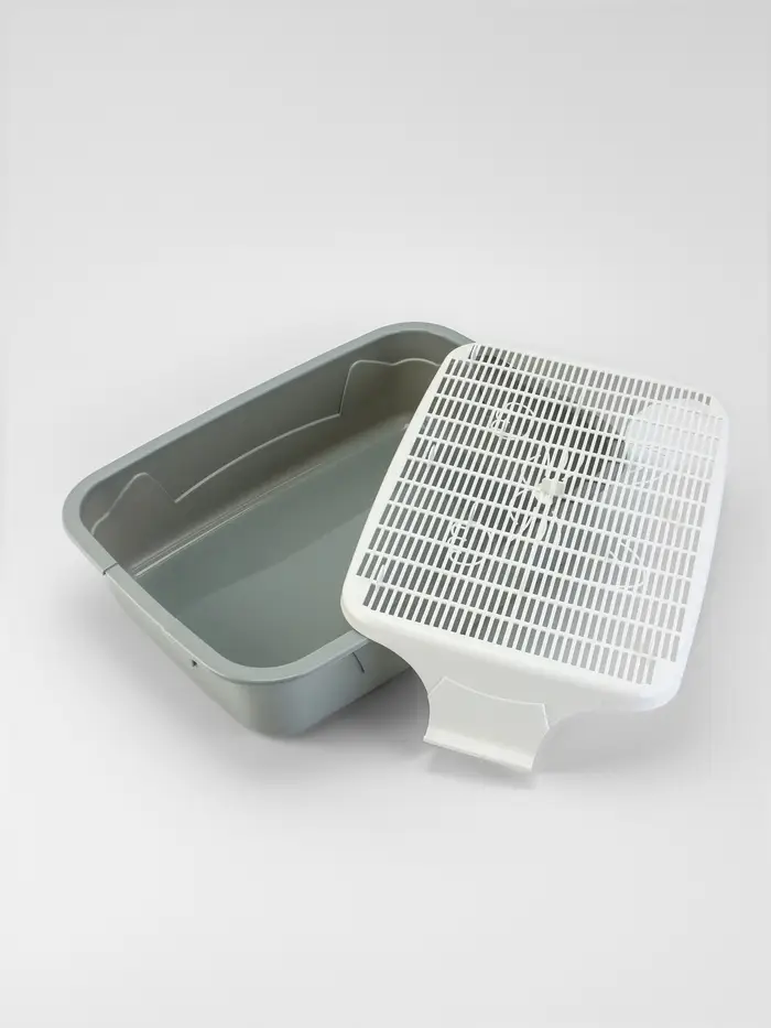 - Функция сетки: Съёмная решётка на высоте 1,5 см создаёт барьер между свежим наполнителем и отходами. Кошка ходит по сетке, а использованные гранулы остаются внизу. Это уменьшает запахи и продлевает срок службы наполнителя.