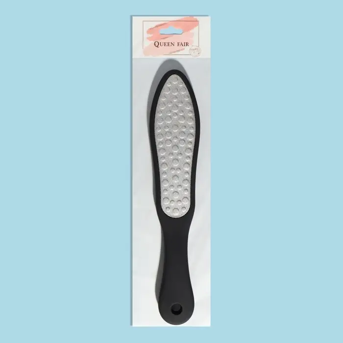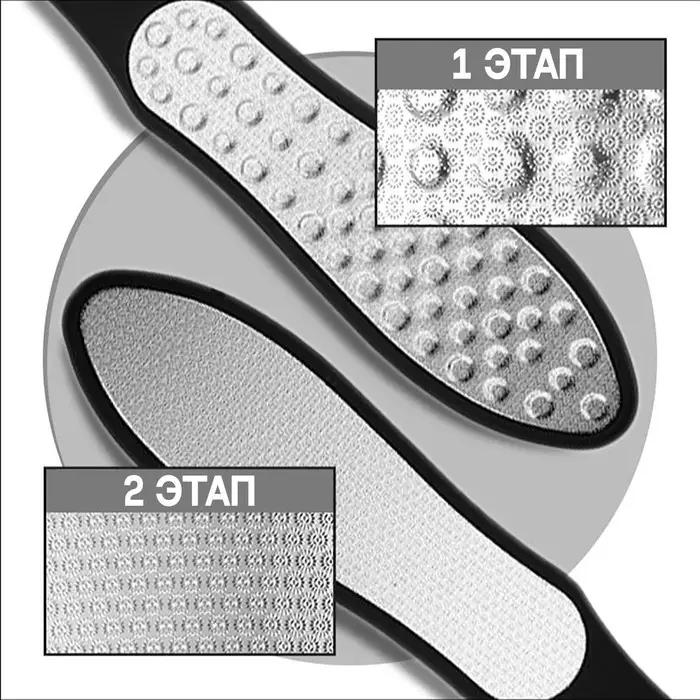 За счёт дизайна, тёркой могут пользоваться не только женщины, но и мужчины. На металлической поверхности с помощью лазера сделаны микрозубчики, которые за 10 пропилов снимут 1 мм огрубевшей кожи. Другая сторона тёрки отполирует уже подготовленный участок до идеального состояния. Проводить такую процедуру можно как на распаренной коже ног, так и на сухой. Комфортную эксплуатацию педикюрного инструмента обеспечит длинная ручка. Между подходами нужно промывать рабочую область в тёплой воде.