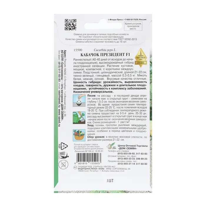 Семена Кабачок «Президент», F1, 5 шт., «Дом семян»