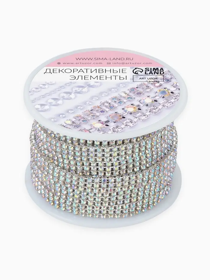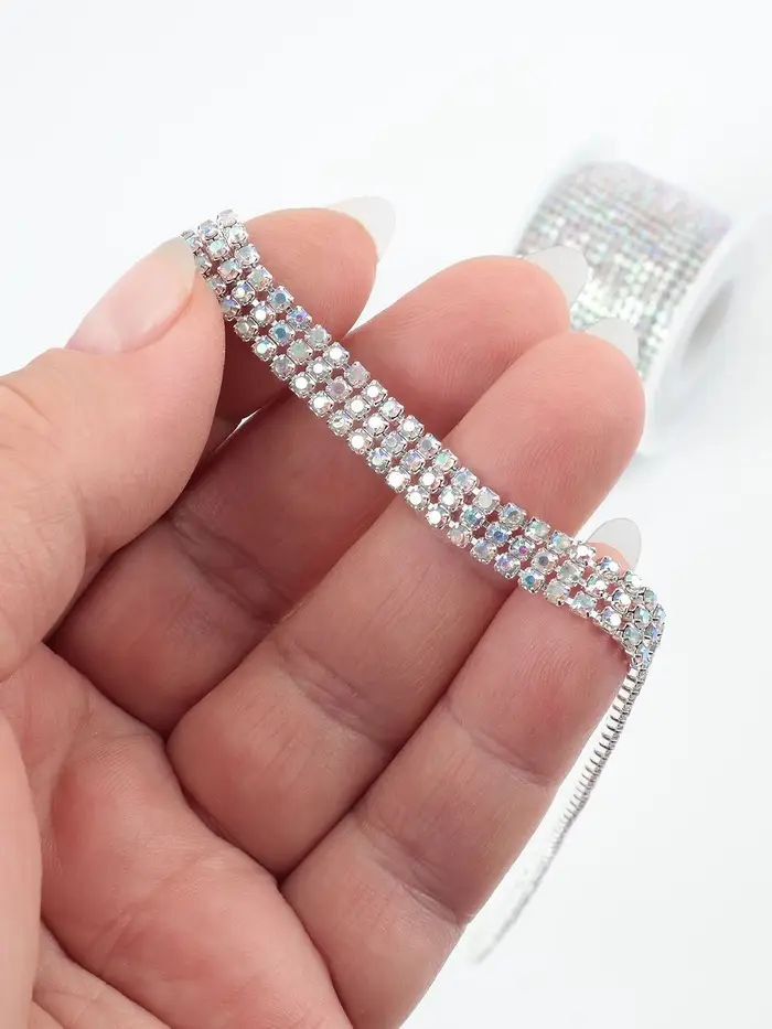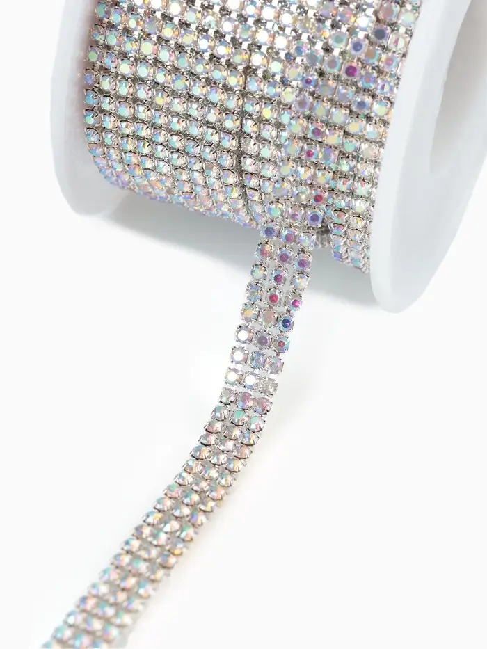 Цепь со стразами и голографическим эффектом — это сочетание прочности и декоративного сияния. Трёхрядная конструкция подчёркивает плотность и равномерное распределение блеска, а серебристый цвет добавляет изделиям холодный переливающийся свет. Ширина 6 мм и общая длина от 4,3 до 4,7 метра делают цепь удобной для разных видов оформления: от одежды до интерьерных акцентов.