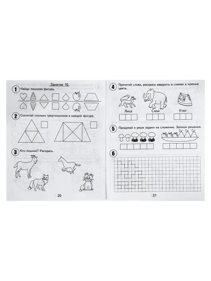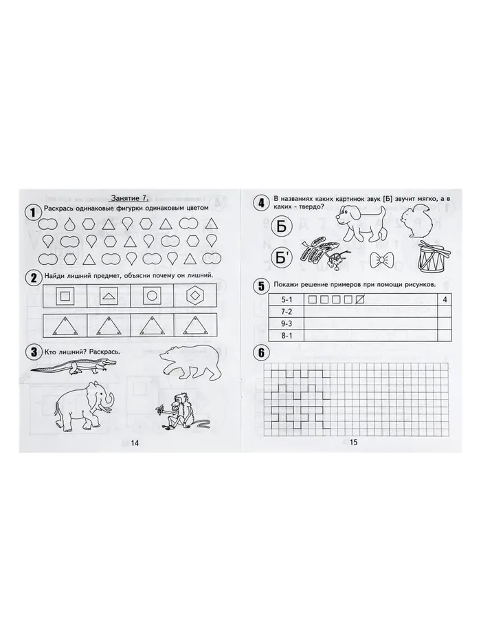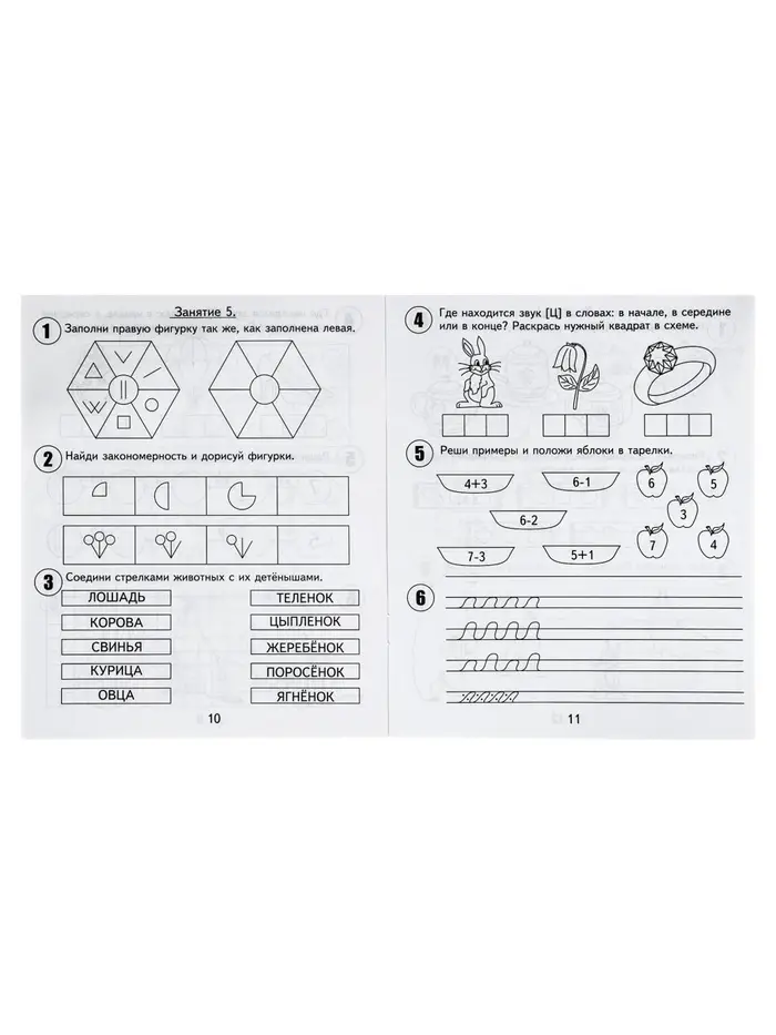 - Каждое занятие состоит из 6 заданий: на развитие внимания, логического мышления, графических навыков и базовых знаний по математике, чтению и окружающему миру.