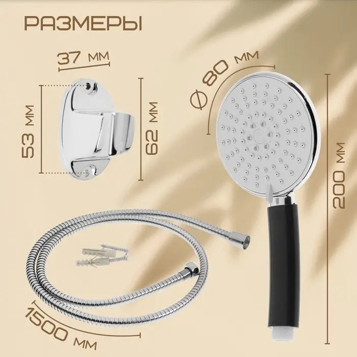 Душевая лейка со шлангом, стойкой, мыльницей и держателем, крепеж в комплекте.
