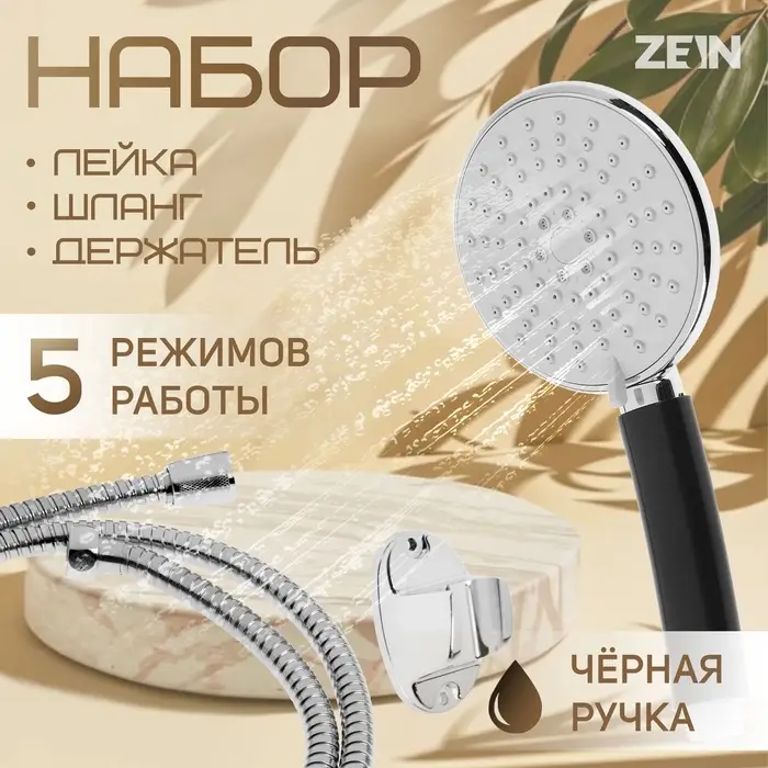 Набор для душа ZEIN Z0401 — сантехническое изделие, применяемое в ванных комнатах и банях. Органично вписывается в интерьер душевых кабин и помывочных помещений банных комплексов. В комплект входят душевая лейка, шланг и настенное крепление.