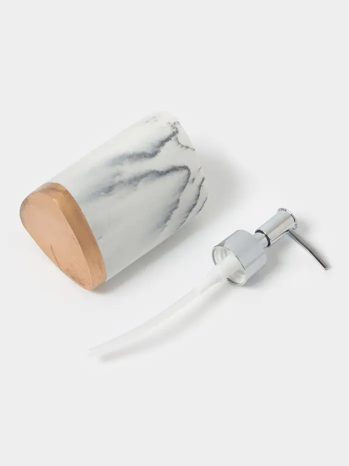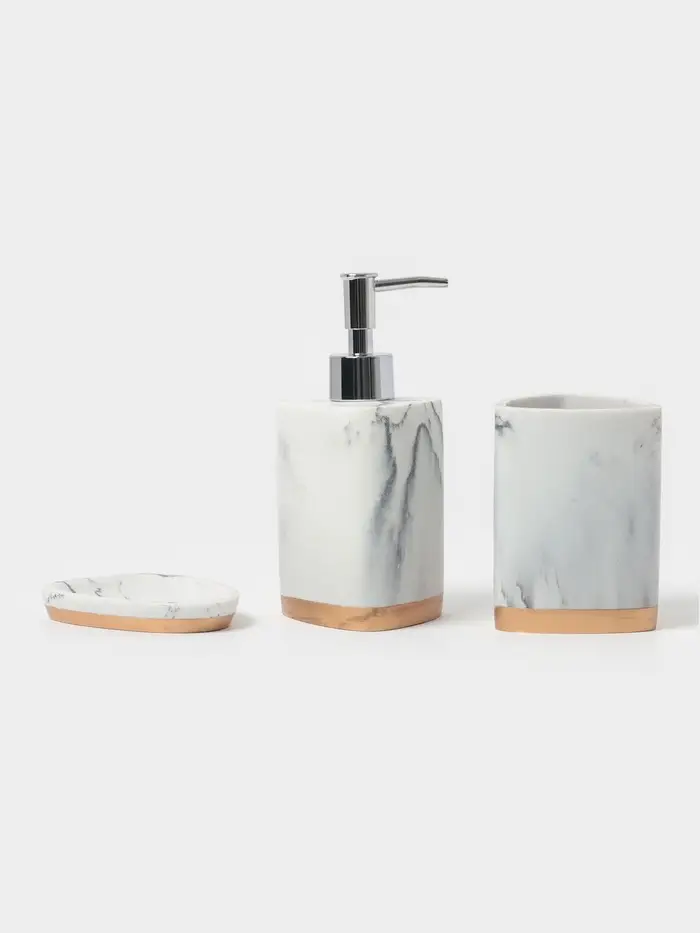 Подарите вашей ванной комнате атмосферу утончённости и элегантности с набором аксессуаров «Мрамор». Этот изысканный комплект, в который входят мыльница, дозатор и стакан, не только привнесёт нотку стиля, но и подчеркнёт ваш безупречный вкус. Прекрасное сочетание белого цвета и мраморного рисунка создаёт ощущение свежести и лёгкости, что делает его идеальным дополнением для любого интерьера.