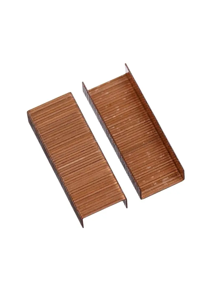 Омедненные скобы из высококачественной оцинкованной стальной проволоки повышенной прочности со специально заостренными углами ножек, увеличивающих пробивную способность. Кассеты не рассыпаются благодаря качественной склейке. Не ржавеют. Пробивают до 20 листов в зависимости от мощности степлера.