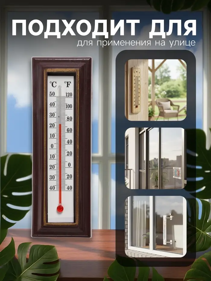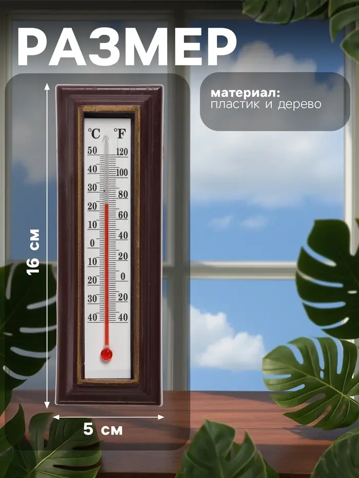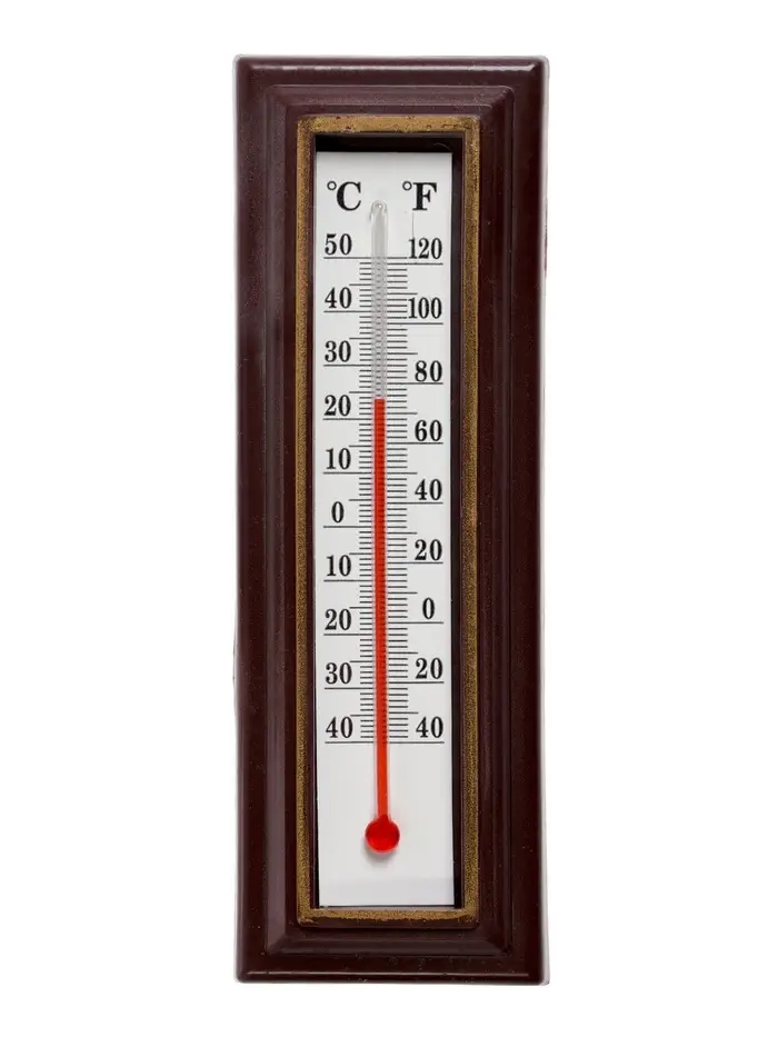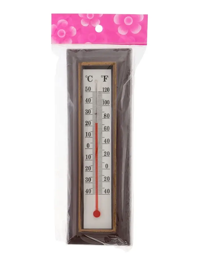 Термометр предназначен для определения температуры воздуха в помещении. Прибор отображает температуру по шкале Цельсия и по Фаренгейту. Жидкость в столбике представляет собой подкрашенный спирт, что делает изделие безопасным в быту. Классический дизайн термометра «под дерево» гармонично впишется практически в любой интерьер.