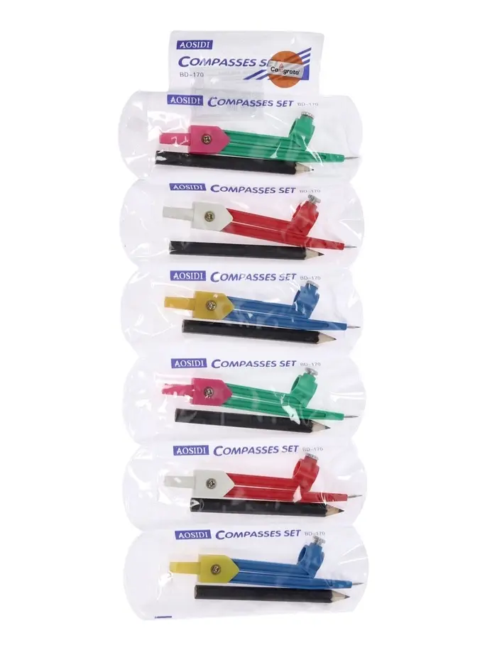 - В набор входят два предмета: пластиковый циркуль диаметром 110 мм и карандаш.