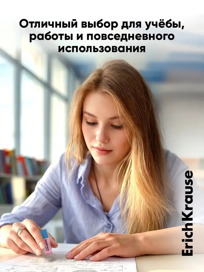 Двусторонний ластик с разной степенью жесткости из экологически чистого и гипоаллергенного материала термопластичной резины (TPR) с пониженным образованием крошек (Dust free). Синяя сторона ластика средней жесткости предназначена для стирания линий от графитового карандаша, розовая жесткая сторона с абразивными свойствами - для стирания чернил шариковых ручек. Размер 54ммх18ммх7,5мм. Не содержит ПВХ.