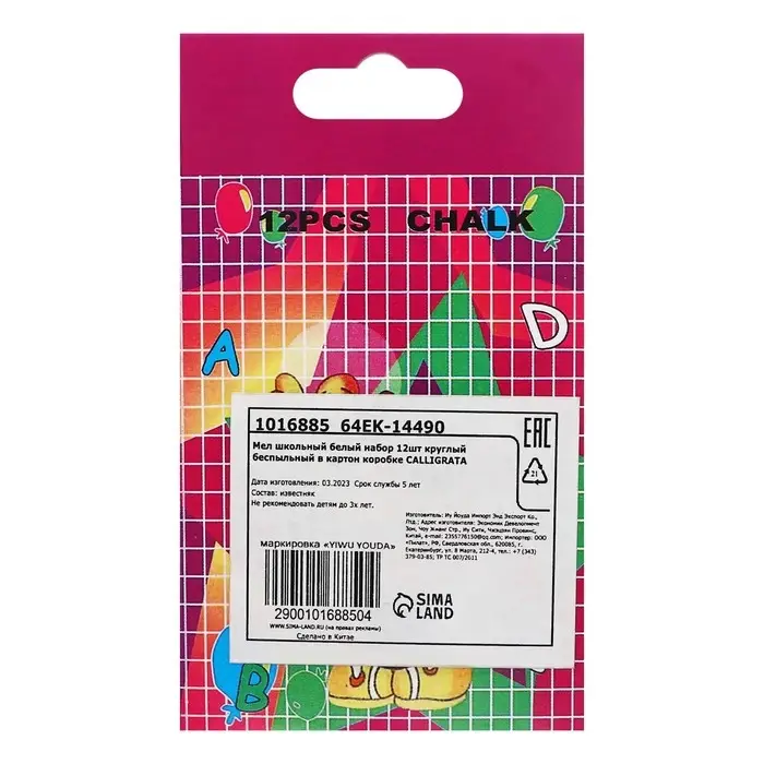 Мел школьный, белый, набор 12 штук, круглый, беспыльный, в картонной коробке