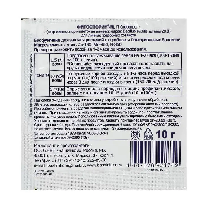 Состав: концентрация действующего вещества — титр живых клеток и спор Bacillus subtilis (штамм 26 Д), не менее 2 млрд КОЕ/г.