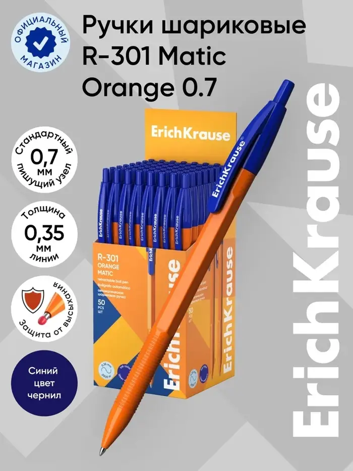 Ручка шариковая ErichKrause. R=301 Matic Orange, автоматическая, синий стержень, узел 0.7 мм
