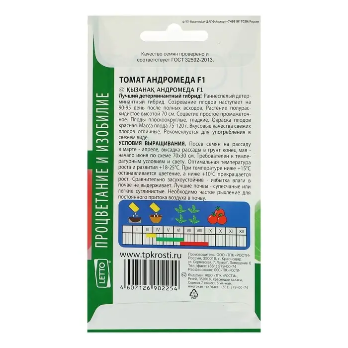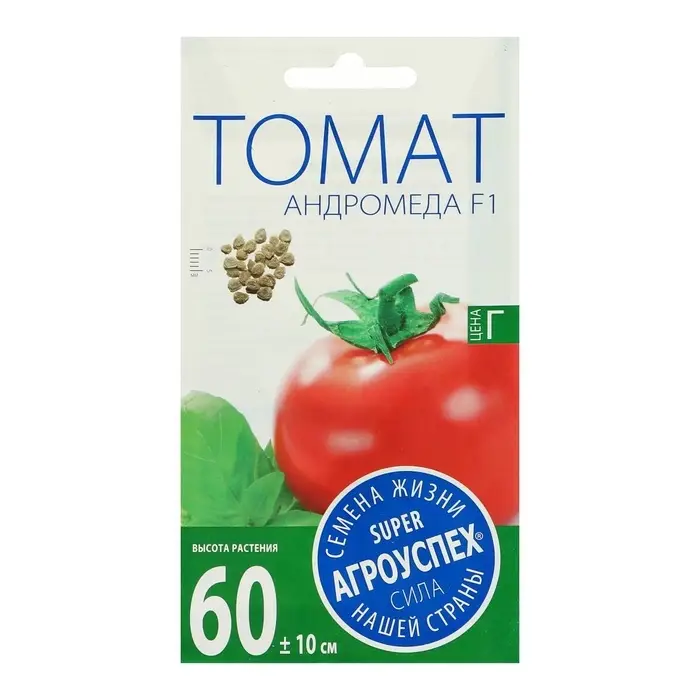 Семена «Томат Андромеда F1», низкорослый, 0,1 г — очень ранний гибрид (период от всходов до первых сборов: 80–87 дней). Растение компактное, высотой до 60 см. Плод плоскоокруглый, гладкий, розовый, без зелёного пятна у плодоножки. Число гнёзд у плода: 2–3. Масса плода: 90–120 г. Вкусовые качества отличные. Товарность и транспортабельность высокие.