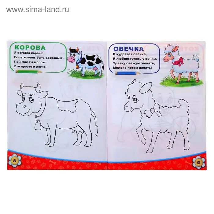 - 12 страниц с изображениями домашних животных и заданиями для дорисовки деталей.