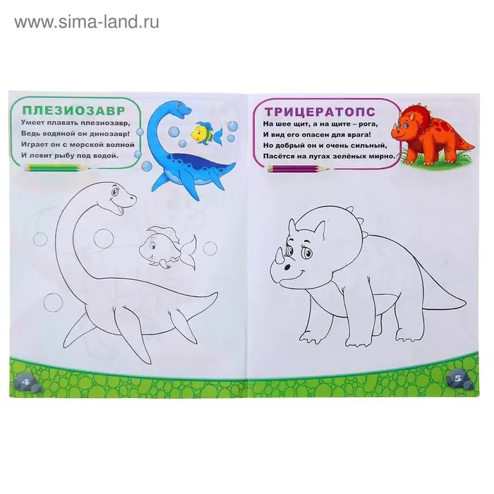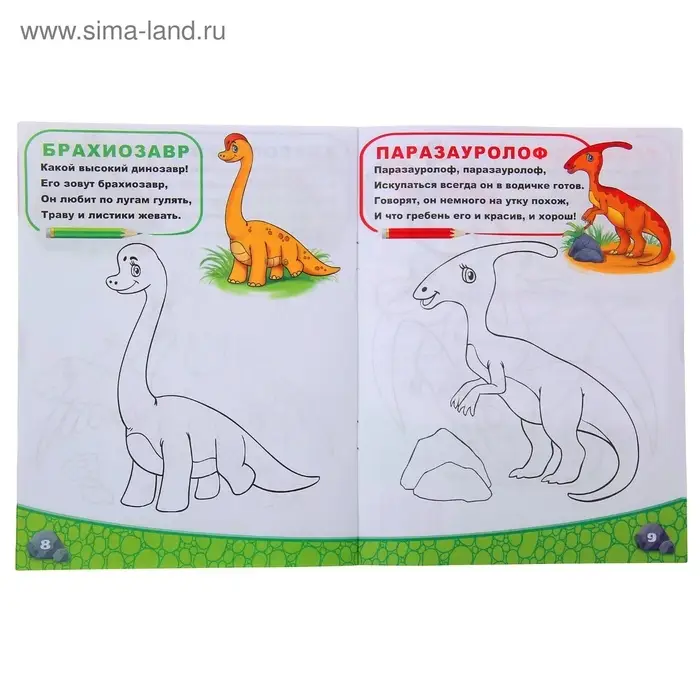 - 12 страниц с изображениями динозавров и заданиями для творческого дополнения.