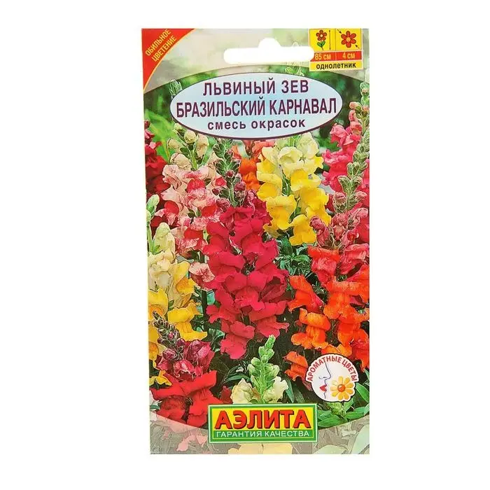 «Бразильский карнавал» — смесь окрасок высокорослого львиного зева с обильным продолжительным цветением. Растение формирует пирамидальные мощные кусты с множеством цветоносов. Крупные ароматные цветки собраны в кистевидные соцветия.