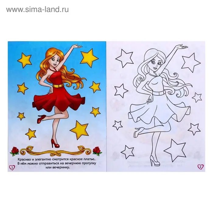 Дочурка познакомится с героинями книги — стильными красавицами — и раскрасит их наряды по образцу.