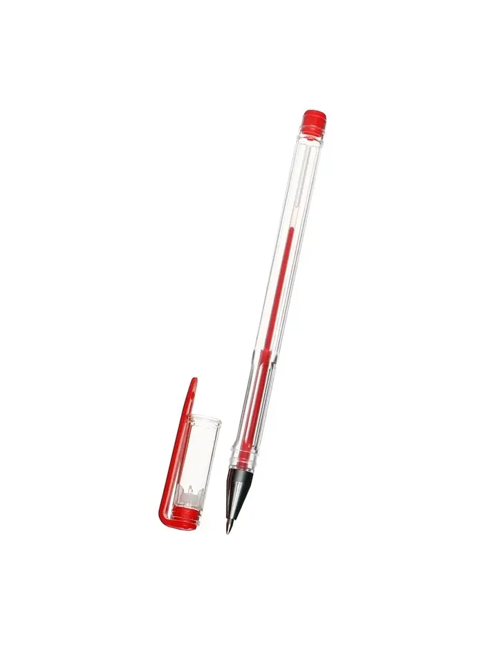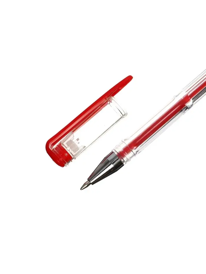 - Неавтоматическая гелевая ручка с красным стержнем и защитным колпачком.