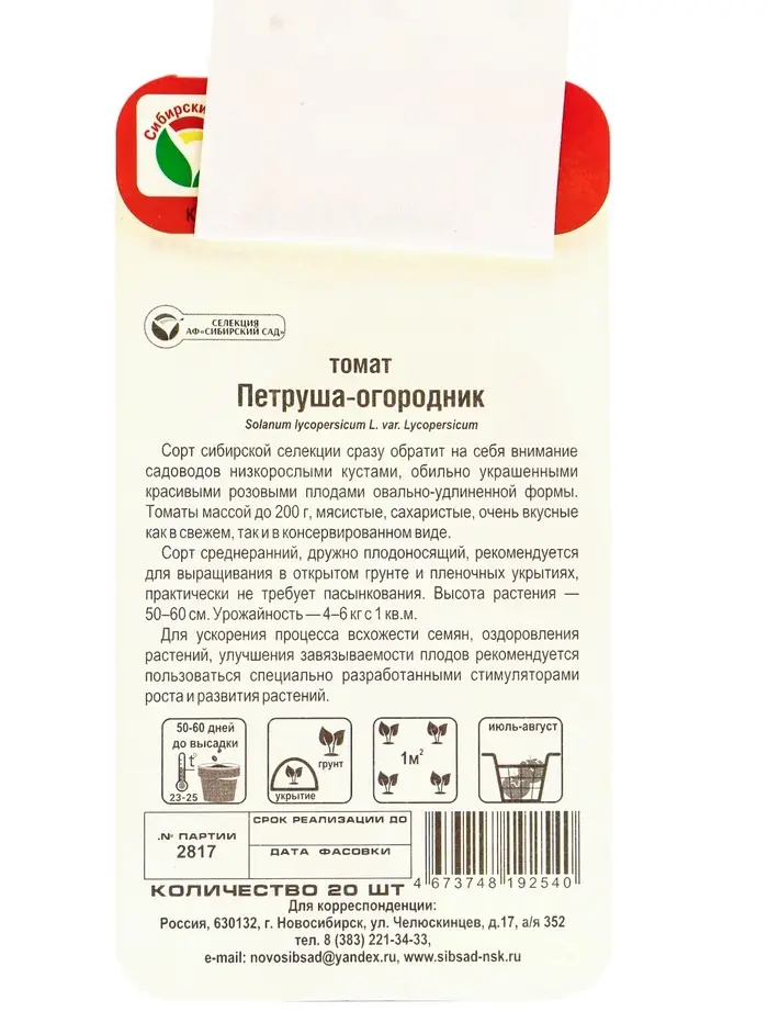 Семена Томат "Петруша-огородник",детерминантный,низкорослый 20 шт
