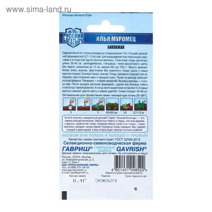 Семена Баклажан "Илья Муромец", ц/п, 0,1 г