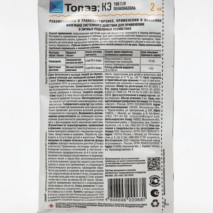 Средство от болезней растений "Август", "Топаз", ампула в пакете, 2 мл