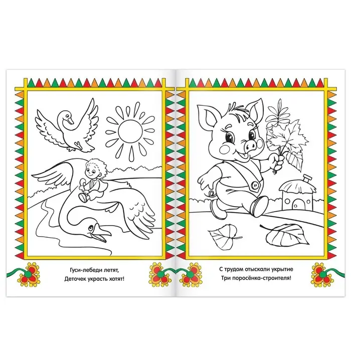 - На каждой странице — отдельный сюжет и небольшой фрагмент текста сказки.