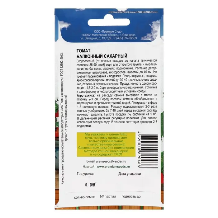 Семена Томат балконный «Балконный сахарный», скороспелый, детерминантный, низкорослый, 0.05 г, Premium seeds