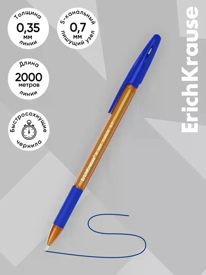 Ручка шариковая ErichKrause R=301 Amber Stick & Grip, узел 0.7 мм, синяя