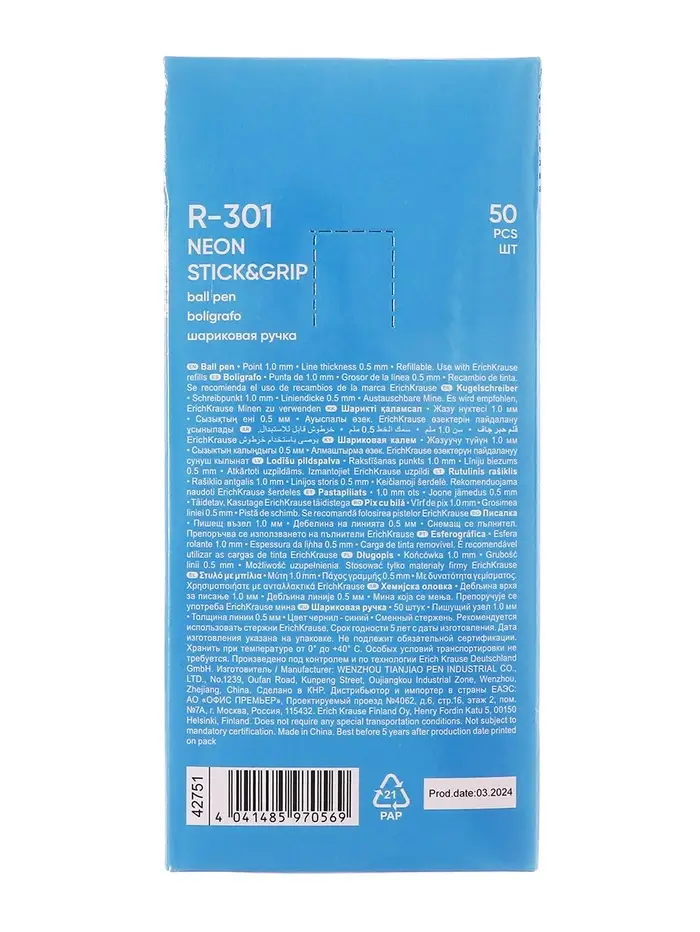 Ручка шариковая ErichKrause R=301 Neon Stick & Grip, узел 0.7-1.0 мм, синяя, резиновый упор, МИКС