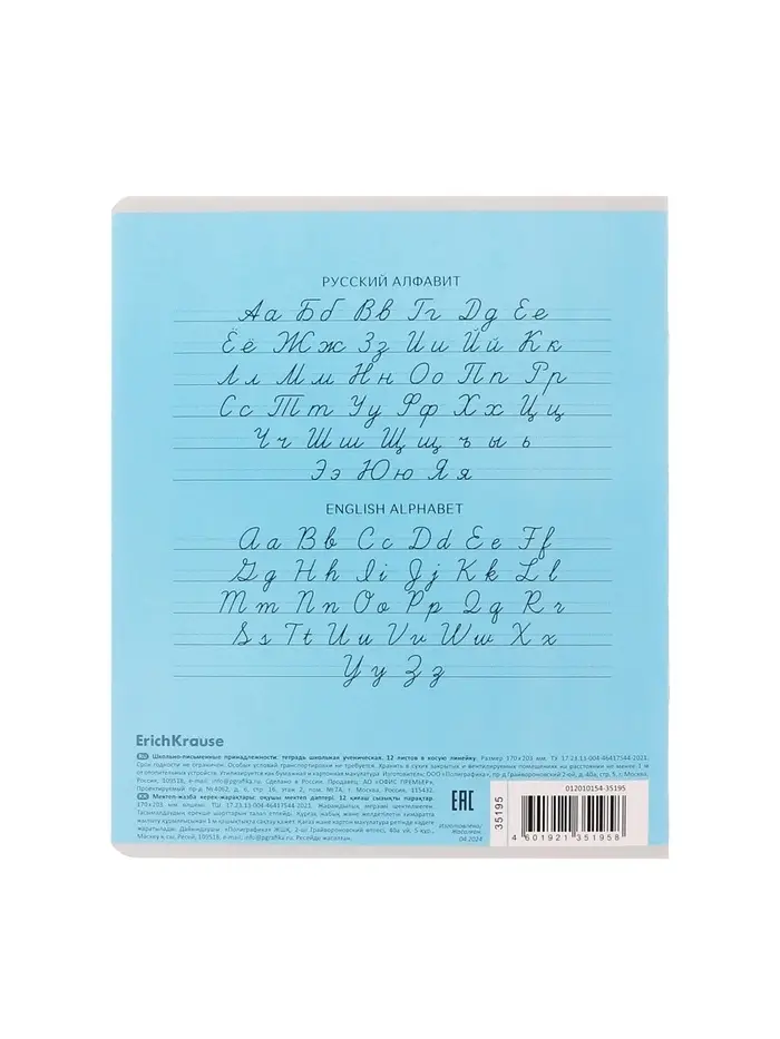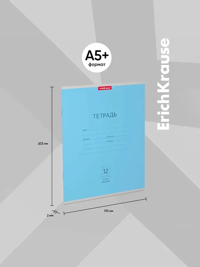 Тетрадь школьная ученическая формата А5+ (170 х 203 мм). Обложка из высококачественного мелованного картона плотностью 180 г/м2. В блоке 12 листов в косую линейку с полями. Бумага офсетная плотностью 60 г/м2. Цвет линовки - синий. Скругленные уголки обложки и блока. Тип скрепления - скоба. Тетради упакованы в термоусадочную пленку по 10 штук.