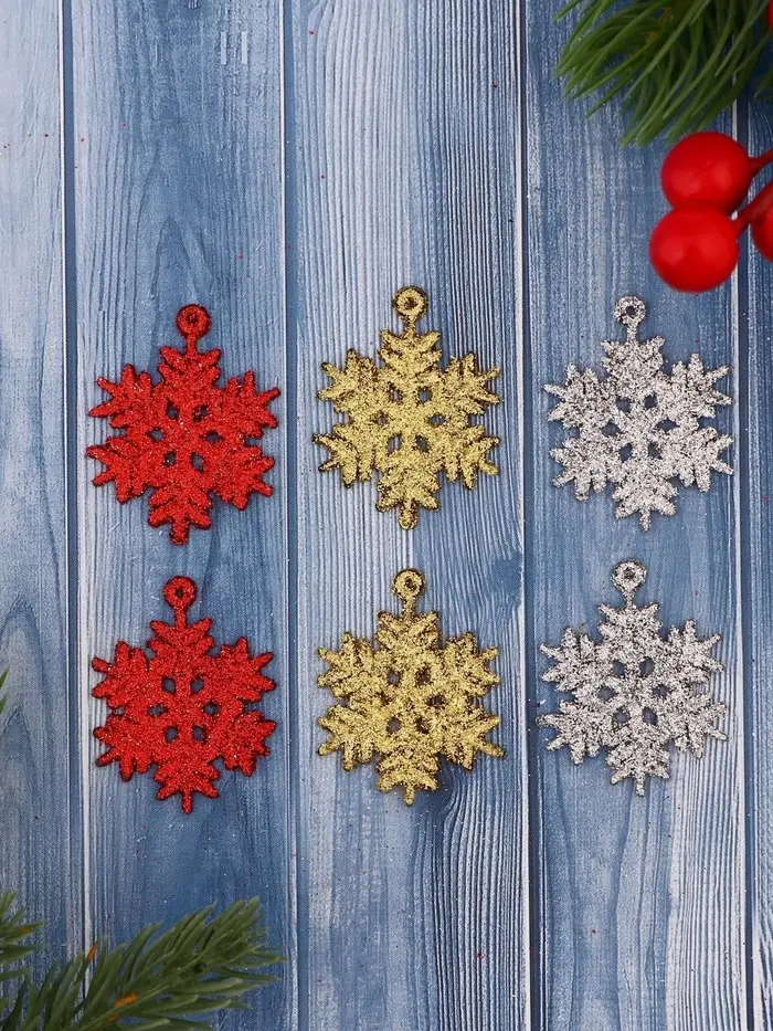 - Шесть снежинок с детализированной резьбой и разнообразной цветовой гаммой.