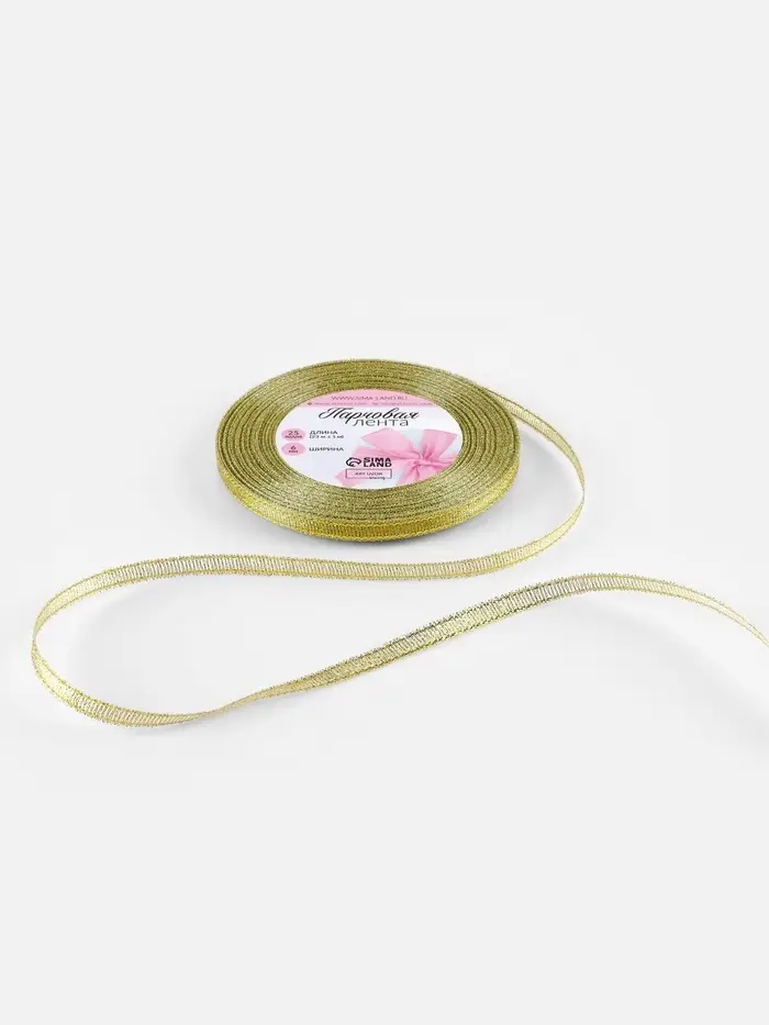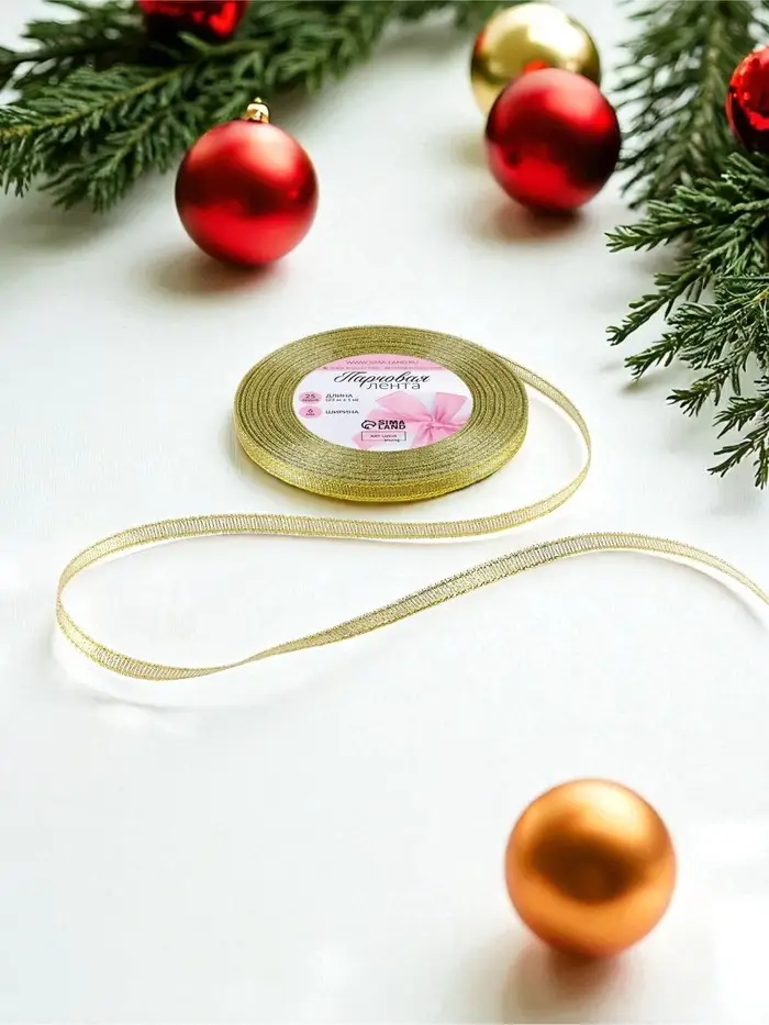 Золотистая парчовая лента шириной 6 мм и длиной около 23 метров станет универсальным элементом для праздничного декора и рукоделия. Её насыщенный цвет и плотная текстура подходят для оформления подарков, создания украшений и акцентов в интерьере на Новый год и другие торжества.