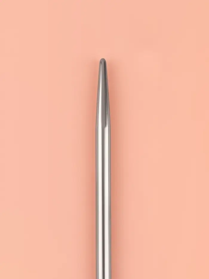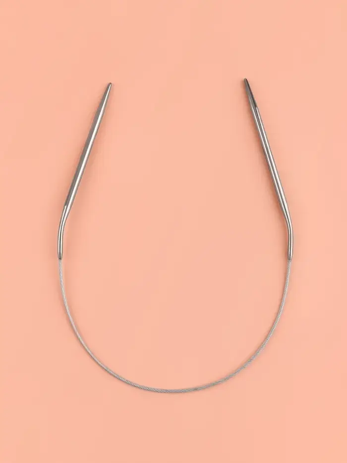Круговые спицы представляют собой две металлические части, соединённые друг с другом тросиком. Инструмент незаменим при вязании полотна по кругу. С его помощью получаются изделия без дополнительных швов: шапки, рукава и горловины.
