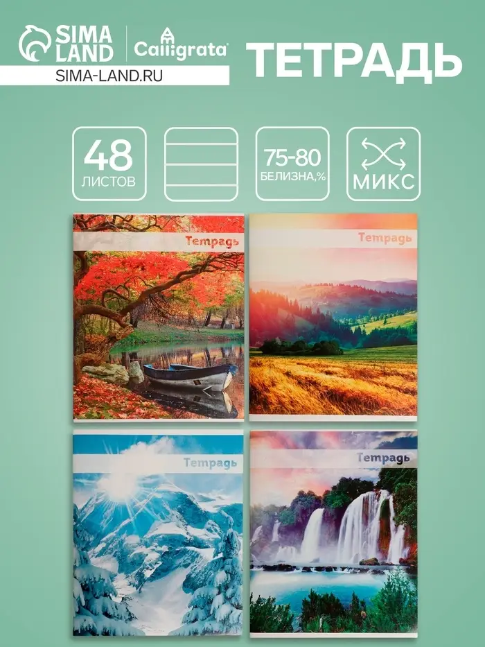 Тетрадь 48 листов в линейку Calligrata «Красоты природы», обложка мелованная бумага, блок №2, белизна 75%, МИКС