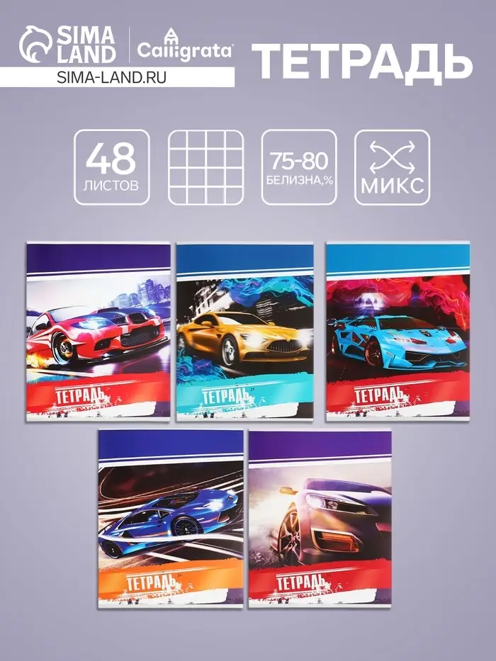 Тетрадь 48 листов в клетку, Calligrata «Авто», обложка мелованный картон, серые листы, МИКС