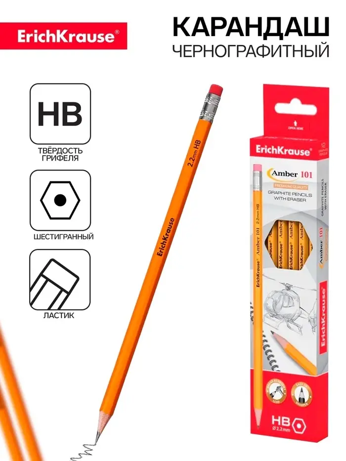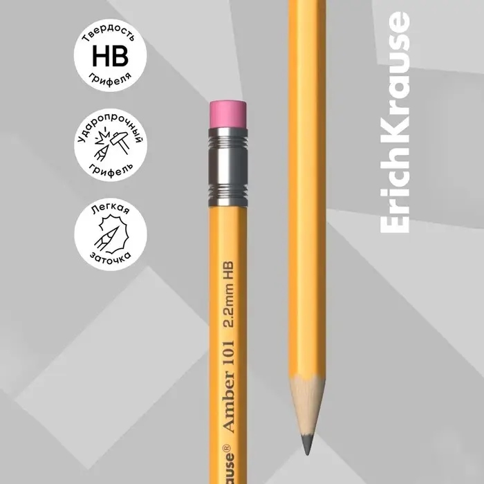 Карандаш чернографитный ErichKrause. Amber 101, НВ, с ластиком, шестигранный