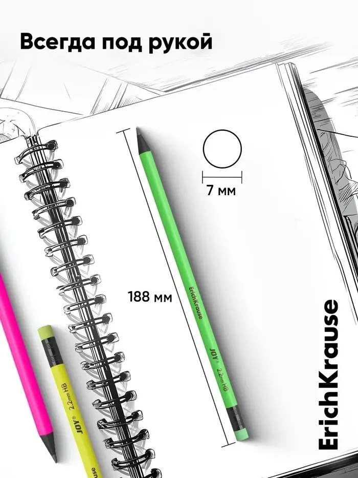 - Яркий неоновый пластиковый корпус: выделяет карандаш, делая его заметным и поднимая настроение.