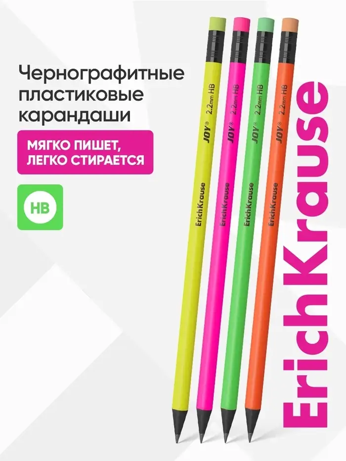 Карандаш чернографитный ErichKrause. JOY, HB, с ластиком, круглый, пластиковый, неоновый корпус, МИКС