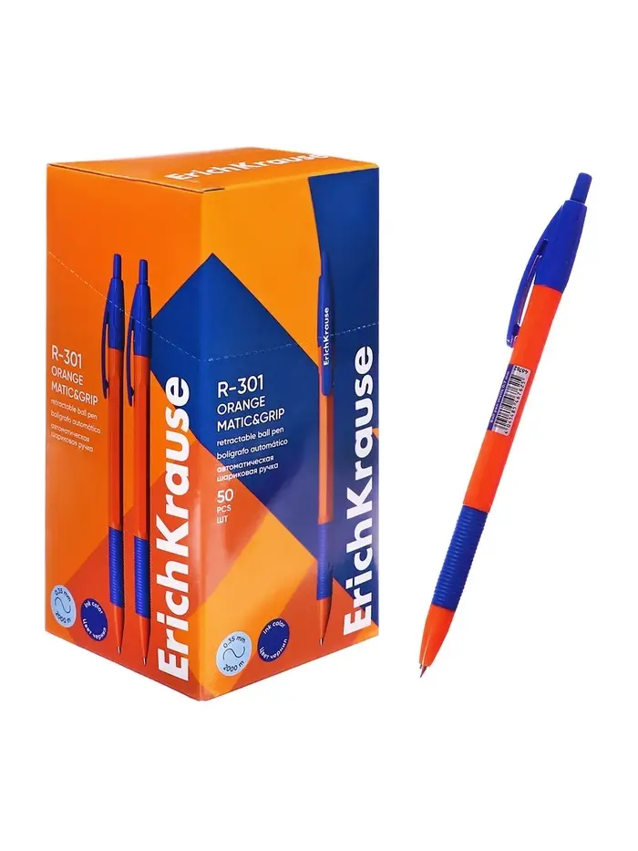 Ручка шариковая ErichKrause. R=301 Orange Matic & Grip, автоматическая, синий стержень, узел 0.7 мм, резиновый упор