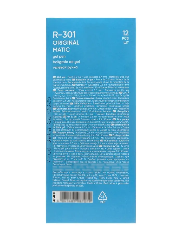 Ручка гелевая ErichKrause. R=301 Original Gel Matic, автоматическая, синий стержень, узел 0.5 мм