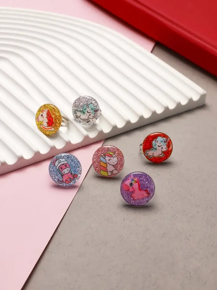 Украшение выполнено с использованием красочных пластиковых вставок с разнообразными рисунками единорогов, которые привлекают внимание и создают атмосферу волшебства и сказки. Такое кольцо отлично дополнит повседневный образ и станет прекрасным подарком для маленькой модницы.