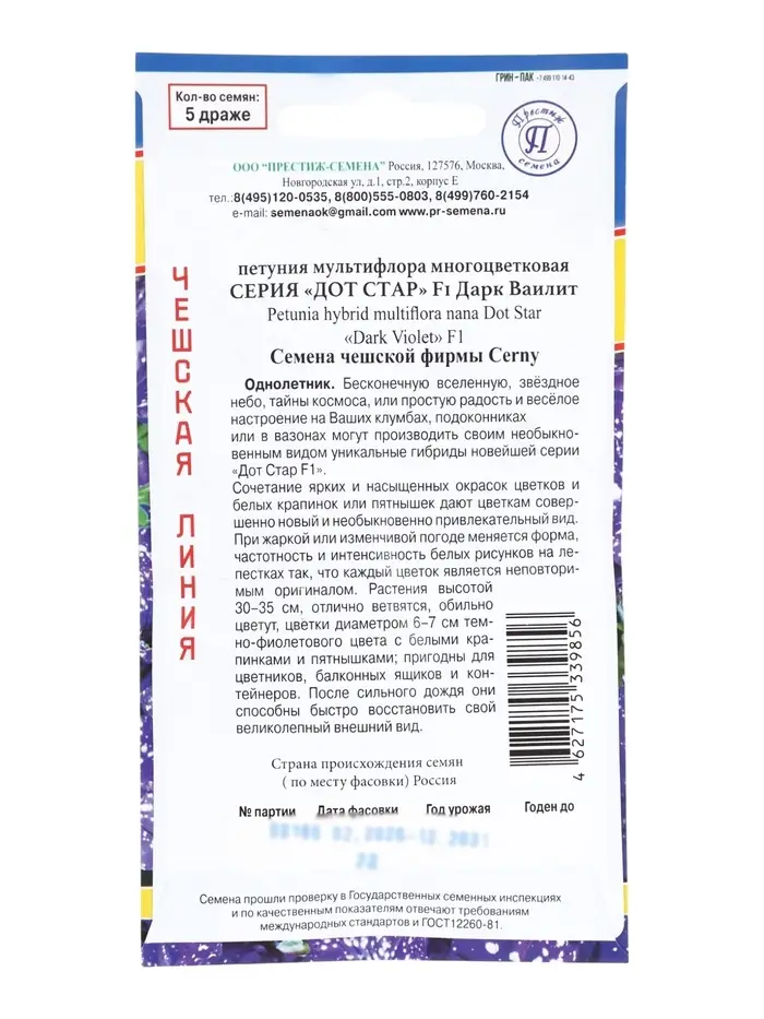 Однолетник. Бесконечную вселенную, звездное небо, тайны космоса, или простую радость и веселое настроение на Ваших клумбах, подоконниках или в вазонах могут производить своим необыкновенным видом уникальные гибриды новейшей серии Дот Стар Е1. Сочетание ярких и насыщенных окрасок цветков и белых крапинок или пятнышек дают цветкам совершенно новый и необыкновенно привлекательный вид. При жаркой или изменчивой погоде меняется форма, частотность и интенсивность белых рисунков на лепестках так, что каждый цветок является неповторимым оригиналом. Растения высотой 30-35 см, отлично ветвятся, обильно цветут, цветки диаметром 6-7 см темно-фиолетового цвета с белым.