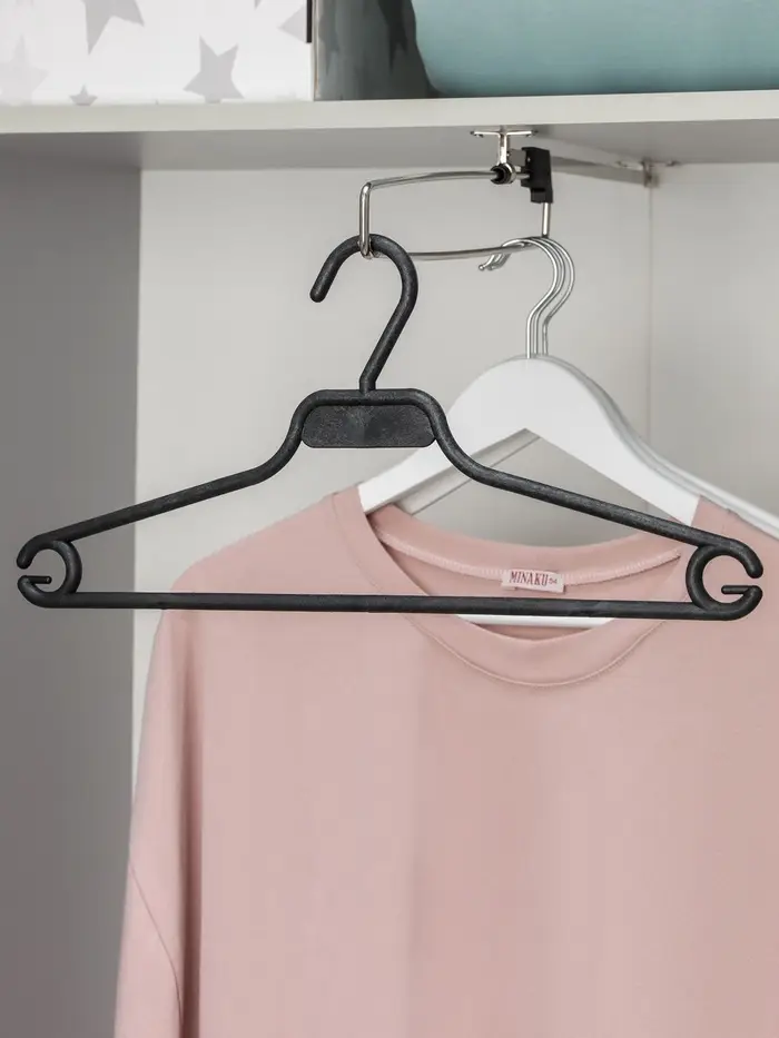 Вешалка – это компактное приспособление, которое позволит вам разместить в гардеробе классические штаны из лёгких или плотных материалов, блузки, рубашки, кофты и другие вещи. Изделие практичной формы занимает мало места, что позволяет экономить пространство в шкафу. Эргономичная форма поможет надёжно зафиксировать одежду и предотвратить её падение.