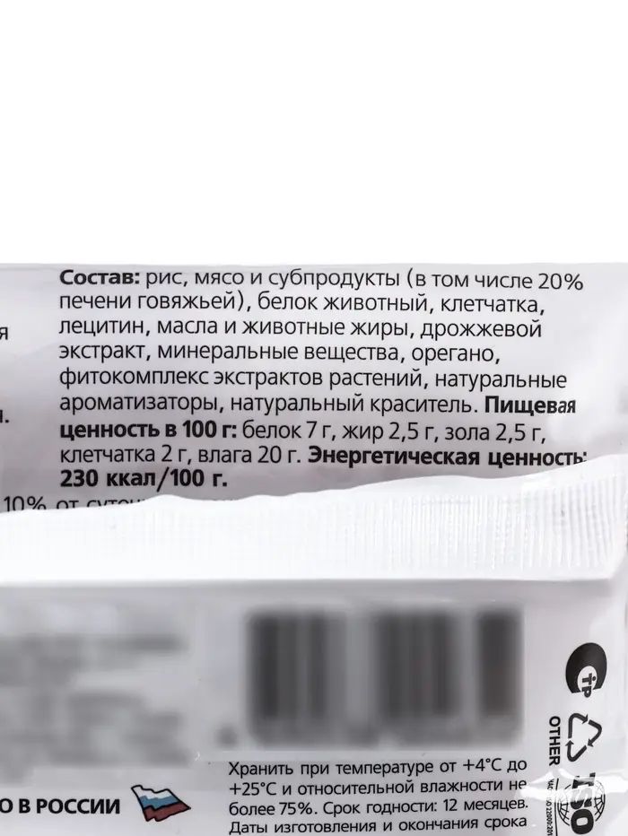 Состав:рис, мясо и субпродукты (в том числе 20% печени говяжьей), белок животный, клетчатка, лецитин, масла и животные жиры, дрожжевой экстракт, минеральные вещества, орегано, фитокомплекс экстрактов растений, натуральные ароматизаторы, натуральный краситель.