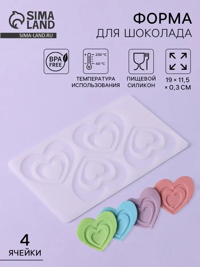 - 4 рельефные ячейки в форме сердца — достаточно для мини-подарка вдвоём или небольшой тематической сервировки.