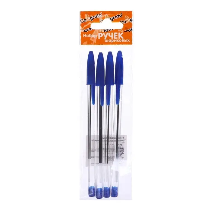 Набор шариковых ручек Calligrata, 4 штуки, синий стержень, узел 0.7 мм, прозрачный корпус с синим колпачком