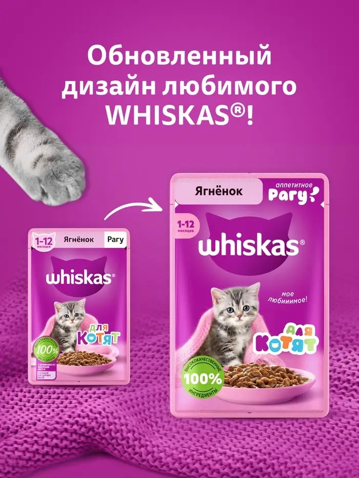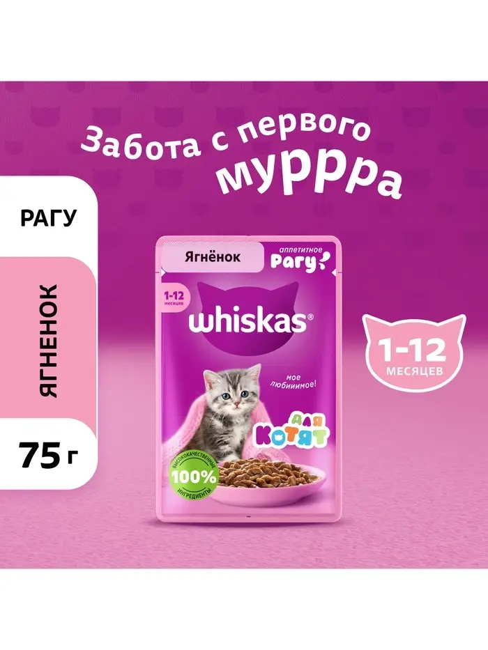 Рацион Whiskas® для котят ""Рагу с ягненком"" — это сбалансированный рацион для здорового роста вашего малыша. Котенок с удовольствием попробует маленькие нежные кусочки с ягненком в ароматном соусе. Все для замурррчательной жизни! Рационы Whiskas® для котят позаботятся об иммунитете, поддержат здоровое пищеварение и обеспечат здоровый рост и развитие. Котята активно растут и с первых дней нуждаются в правильном питании.