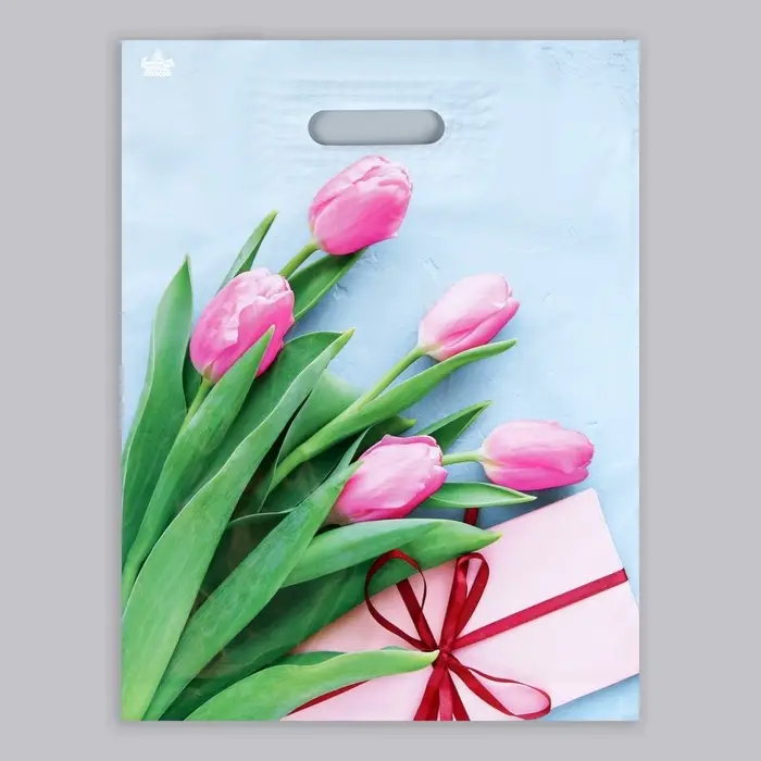 - Нежный весенний дизайн: Яркие тюльпаны на светлом фоне выглядят свежо и нарядно. Такой пакет особенно уместен для подарков на 8 Марта, день рождения или в качестве дополнения к букету.